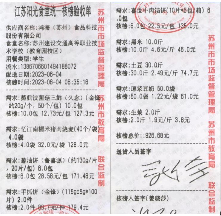 江苏阳光食堂统一核磅验收单(20230604-食材)