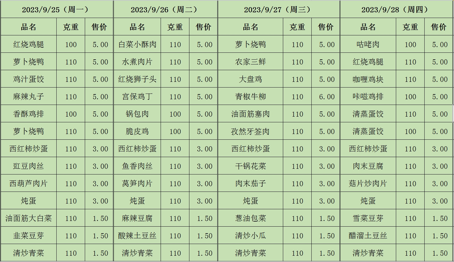周菜单(2023年9月25日-9月28日--教育园校区食堂)