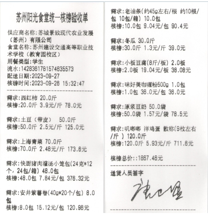 苏州阳光食堂统一核磅验收单(20230927-食材)