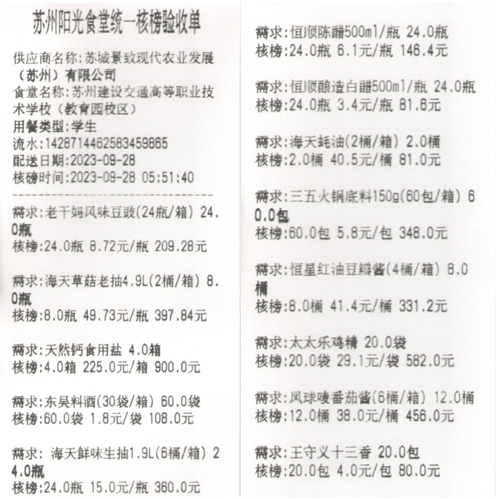 苏州阳光食堂统一核磅验收单(20230928-食材)
