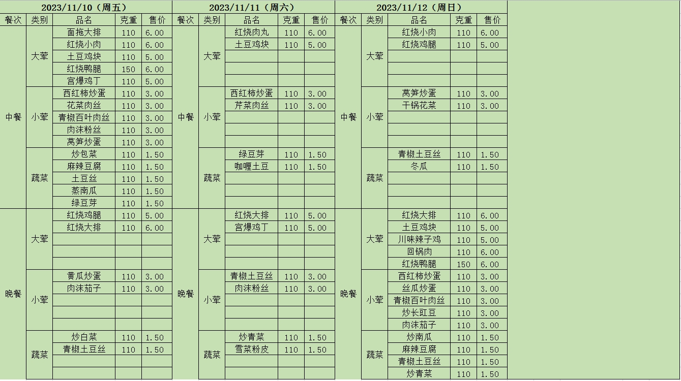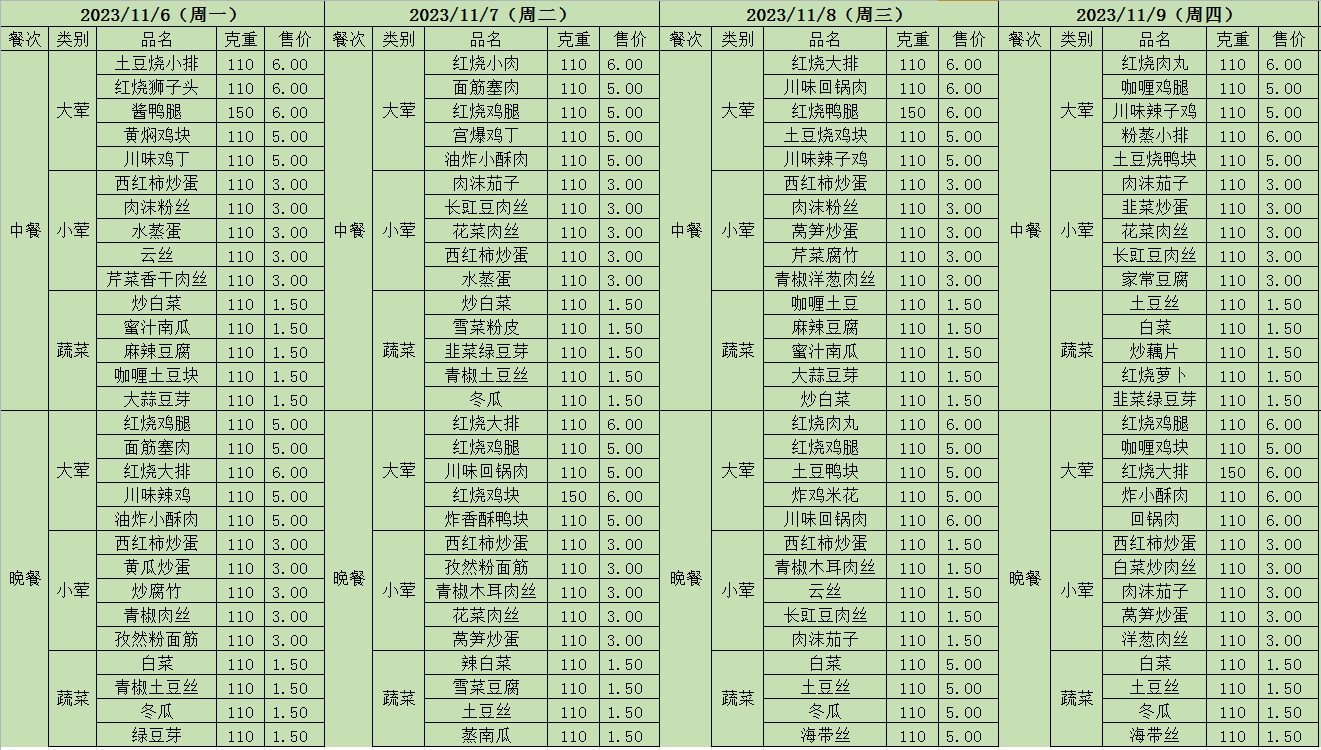 周菜单(2023年11月06日-11月12日--尹山湖校区食堂)