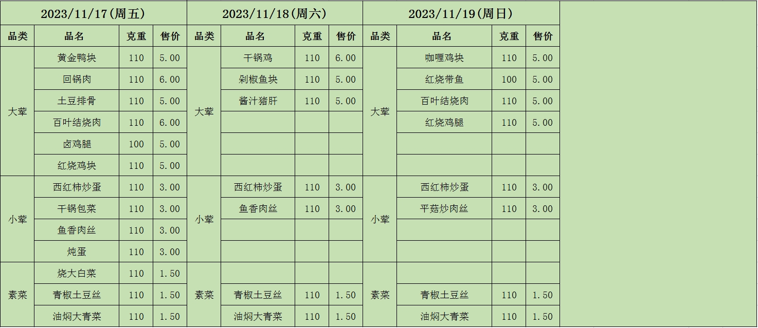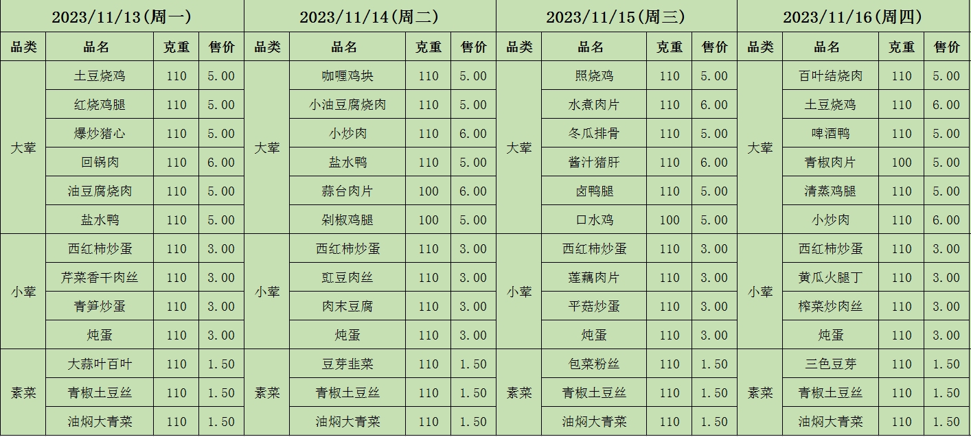 周菜单(2023年11月13日-11月19日--教育园校区食堂)