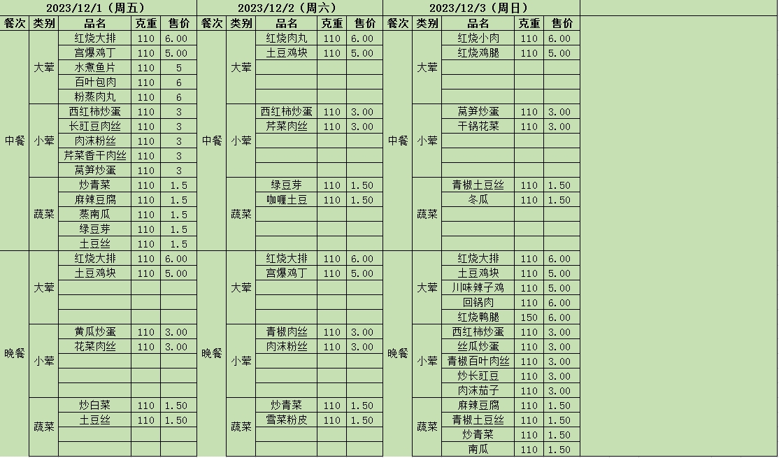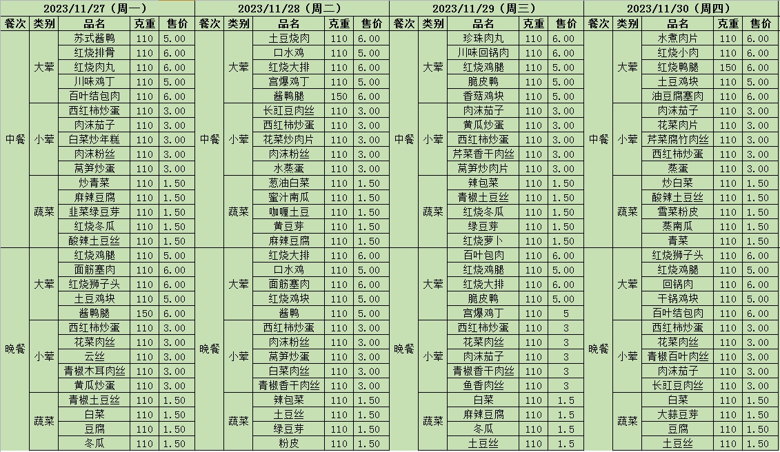周菜单(2023年11月27日-12月03日--尹山湖校区食堂)