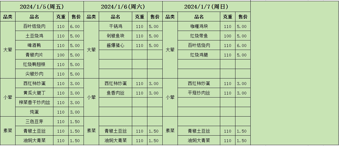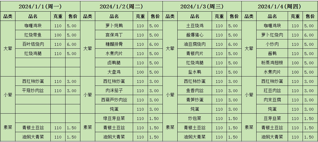周菜单(2024年01月01日-01月07日--教育园校区食堂)