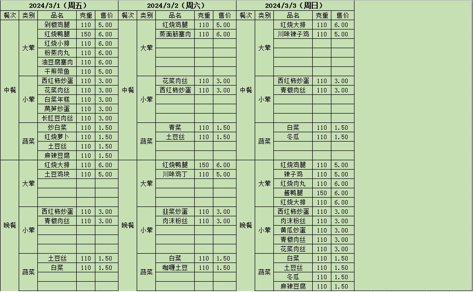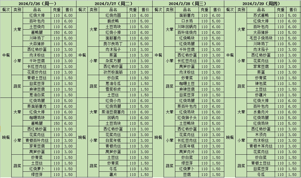 周菜单(2024年02月26日-03月03日--尹山湖校区食堂)