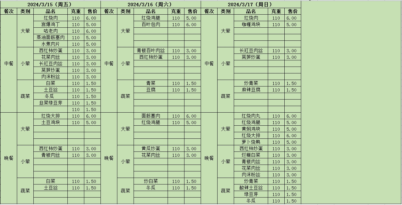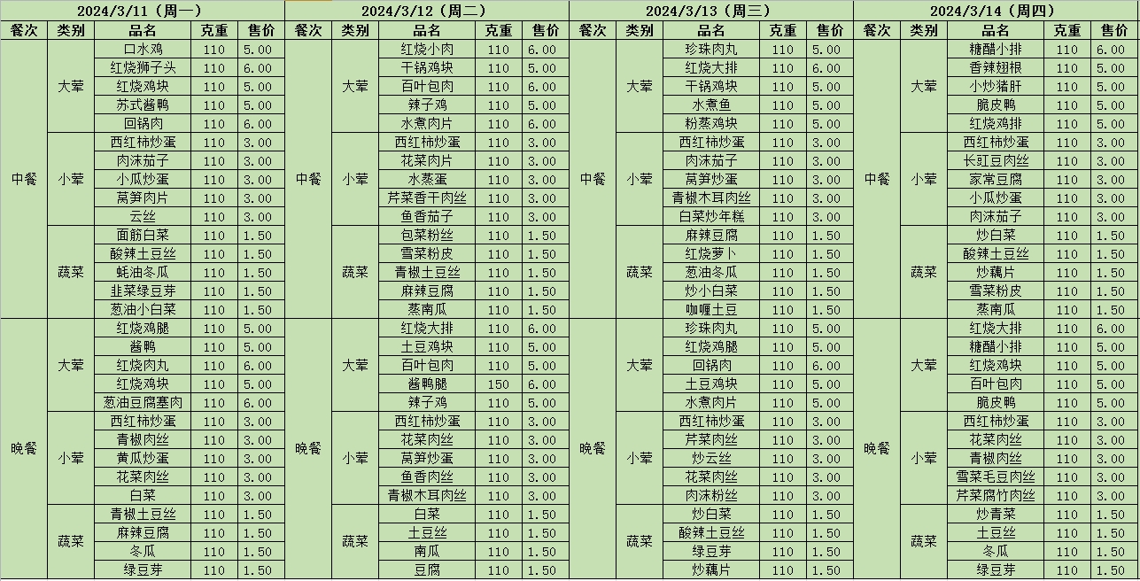 周菜单(2024年03月11日-03月17日--尹山湖校区食堂)