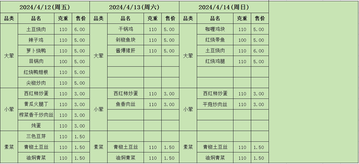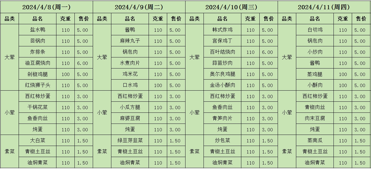 周菜单(2024年04月08日-04月14日--教育园校区食堂)