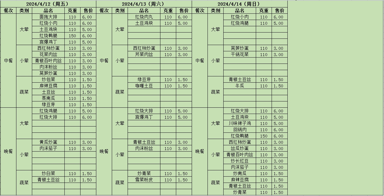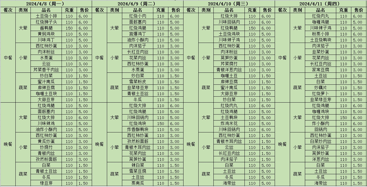 周菜单(2024年04月08日-04月14日--尹山湖校区食堂)