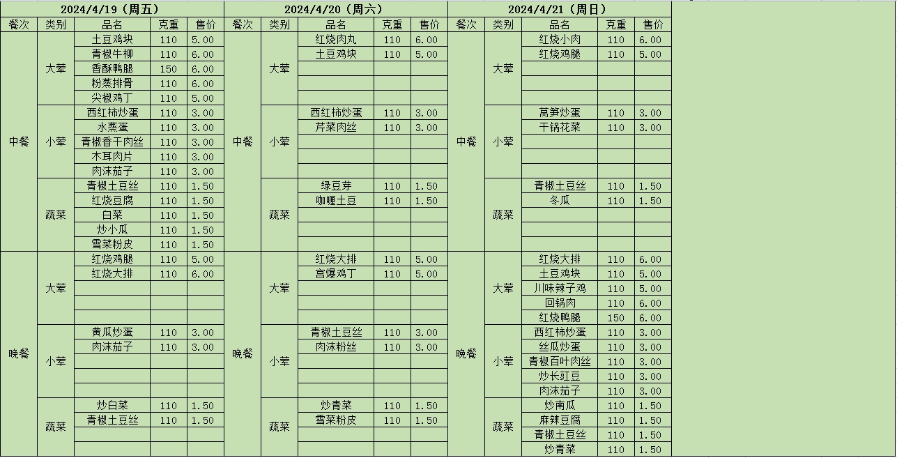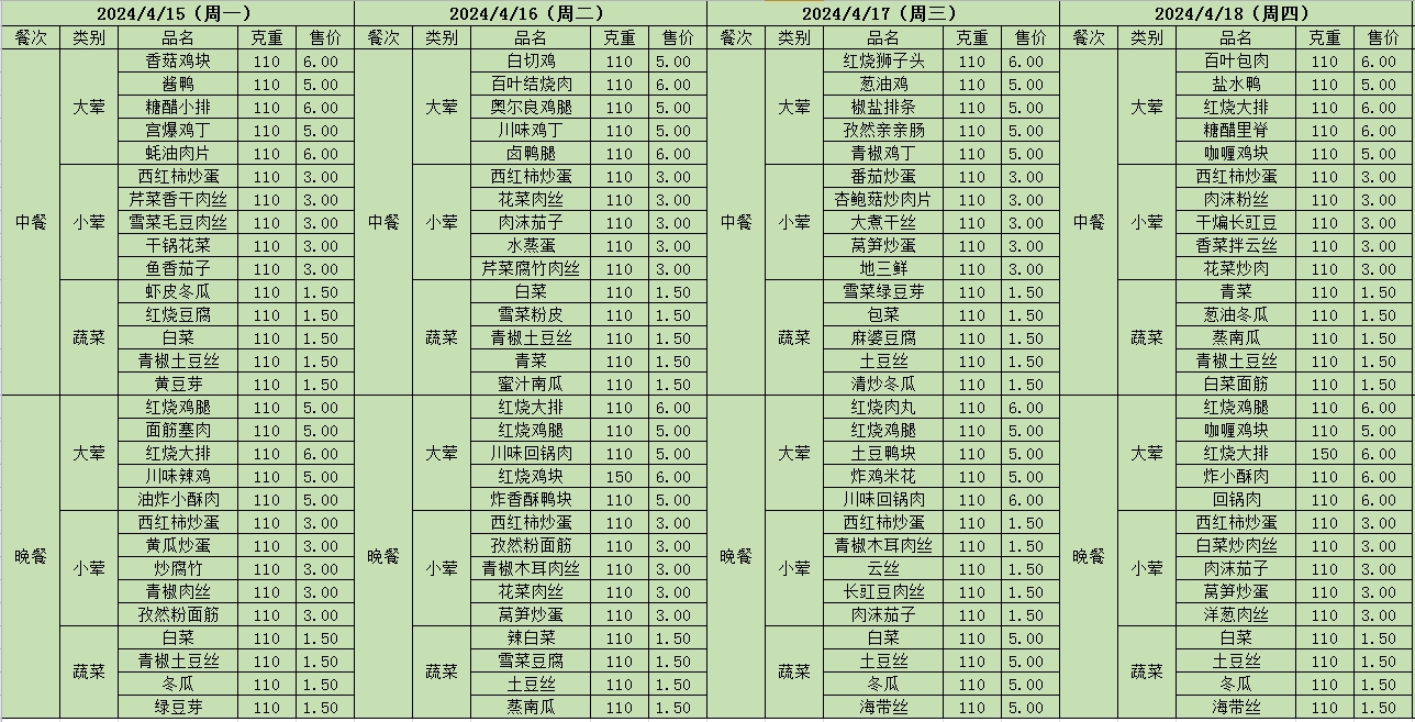 周菜单(2024年04月15日-04月21日--尹山湖校区食堂)