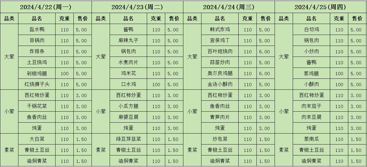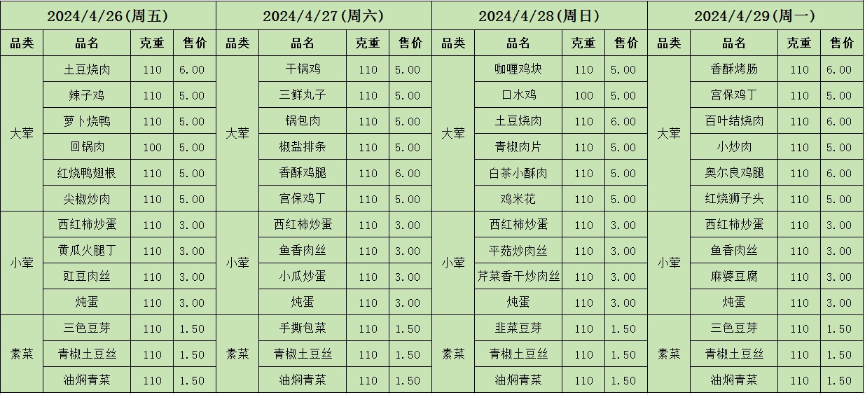 周菜单(2024年04月22日-04月29日--教育园校区食堂)