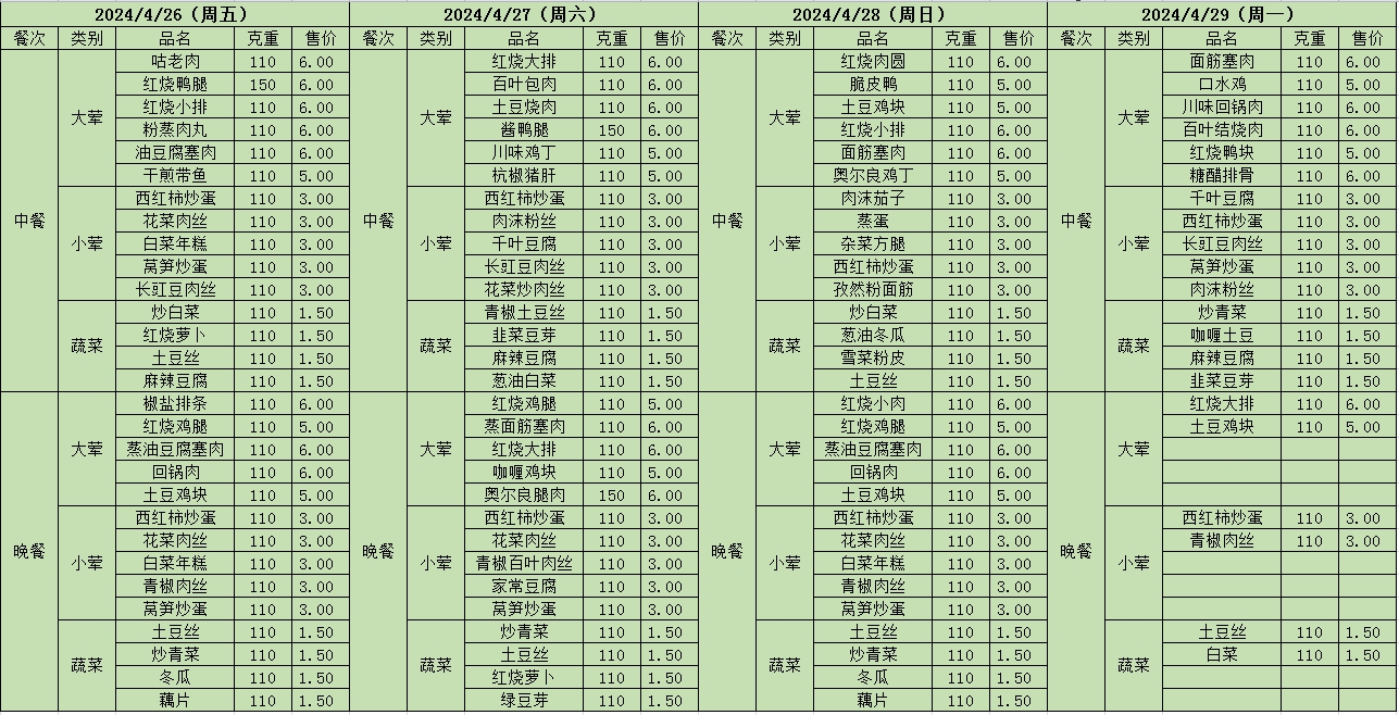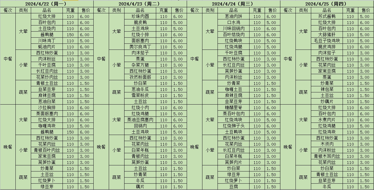 周菜单(2024年04月22日-04月29日--尹山湖校区食堂)