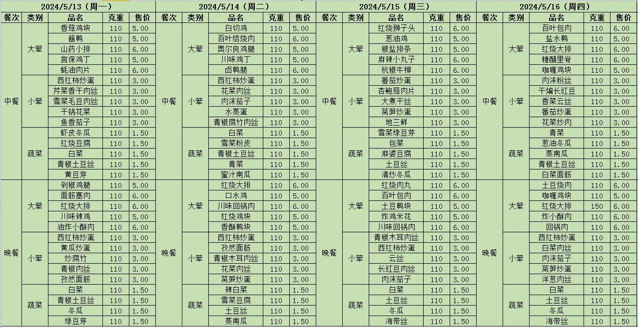 周菜单(2024年05月13日-05月19日--尹山湖校区食堂)