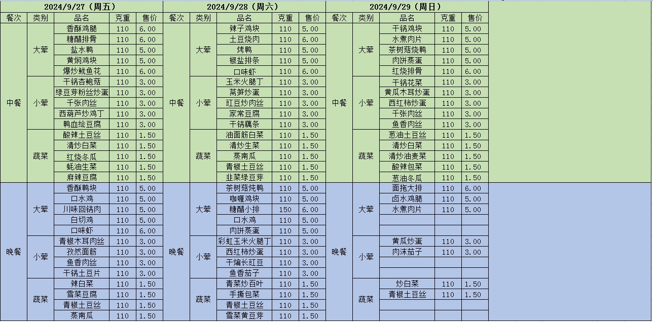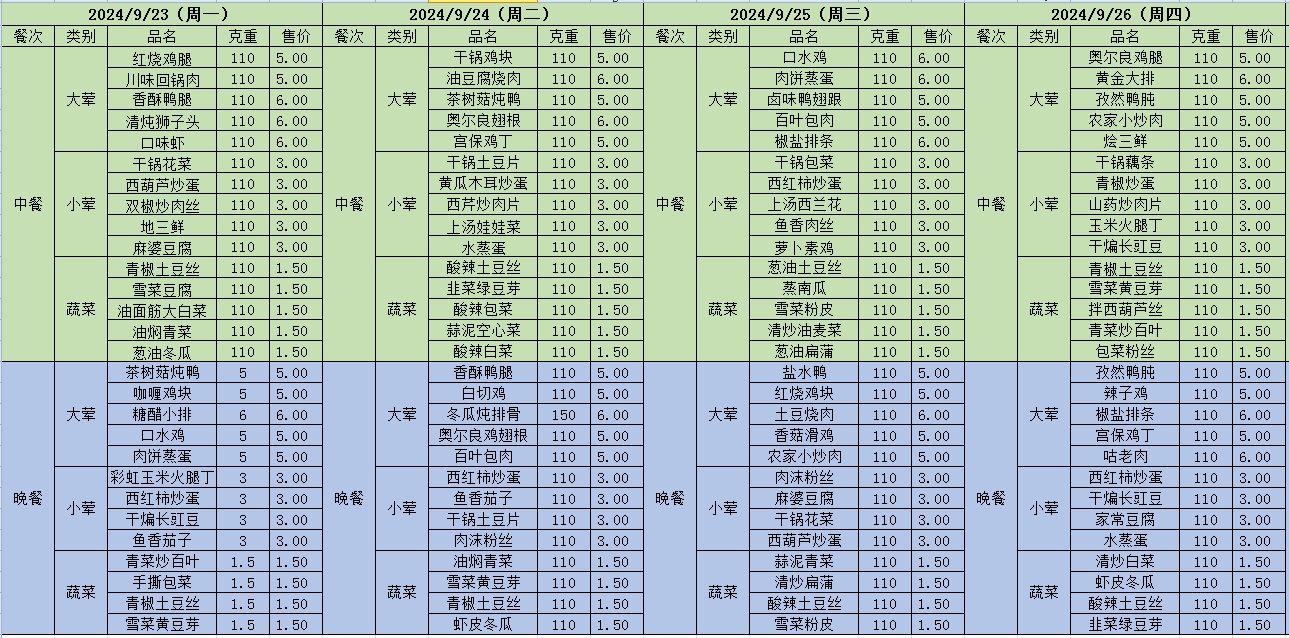 周菜单(2024年09月23日-09月29日--尹山湖校区食堂)