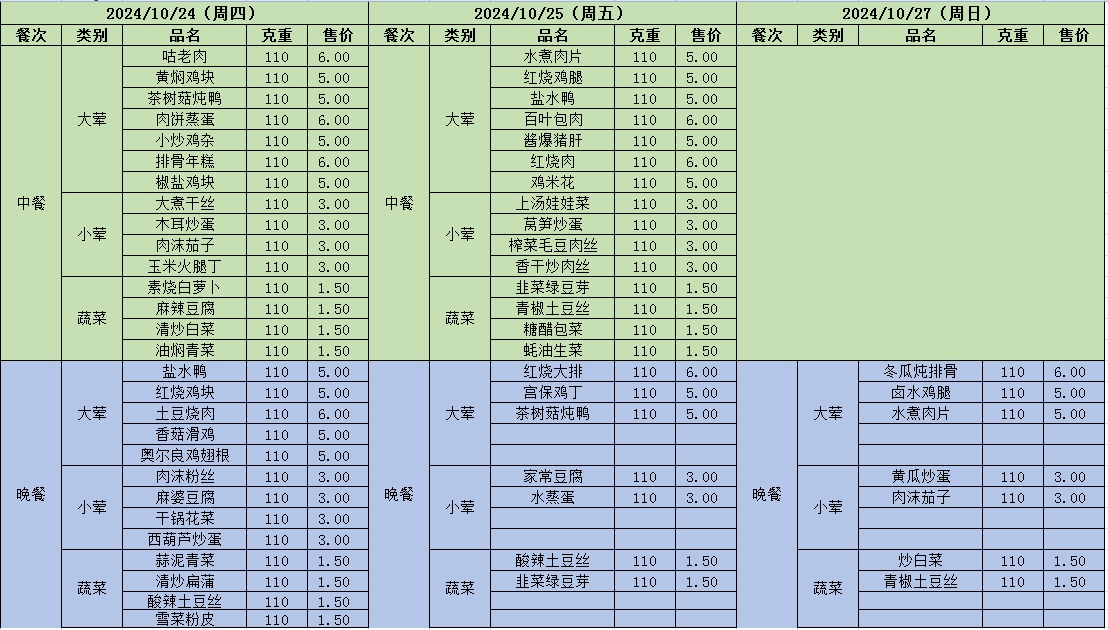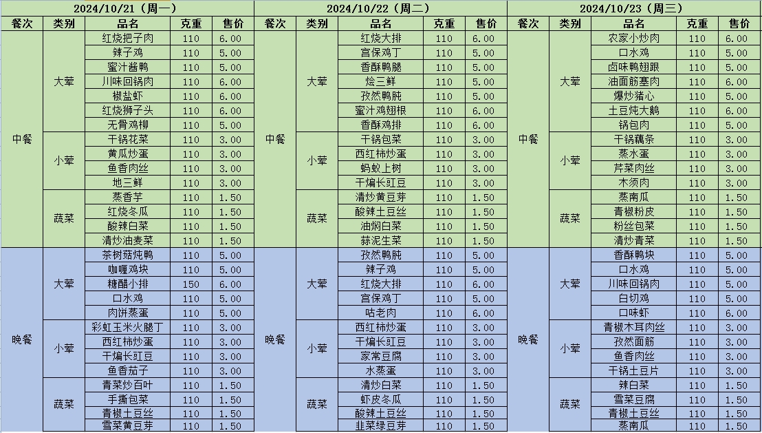 周菜单(2024年10月21日-10月27日--尹山湖校区食堂)