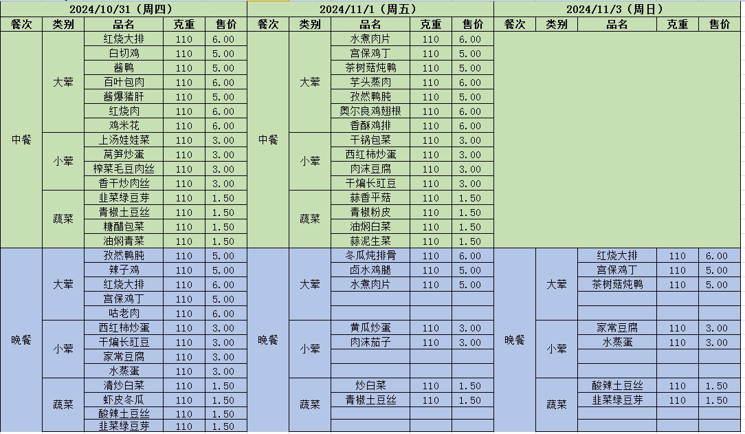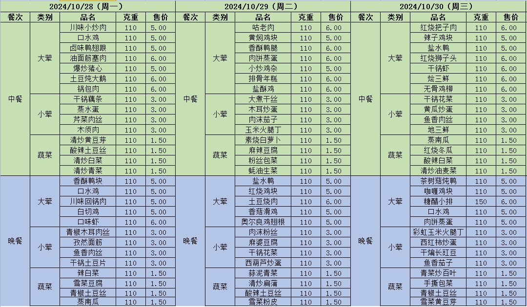 周菜单(2024年10月28日-11月03日--尹山湖校区食堂)