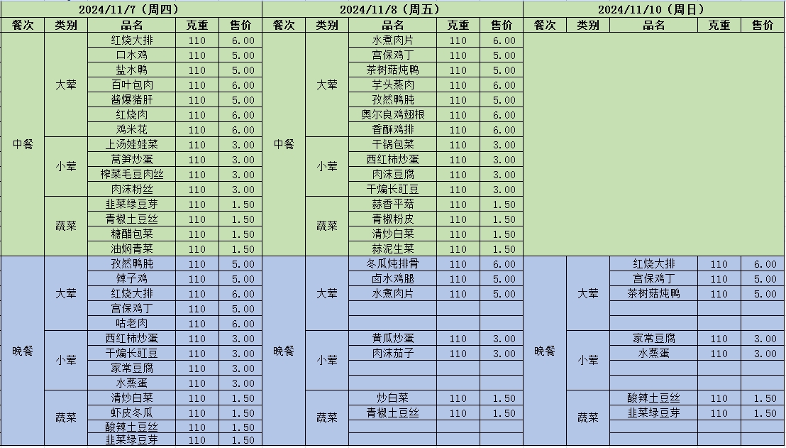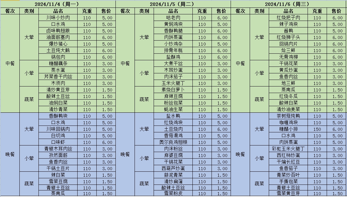周菜单(2024年11月04日-11月10日--尹山湖校区食堂)