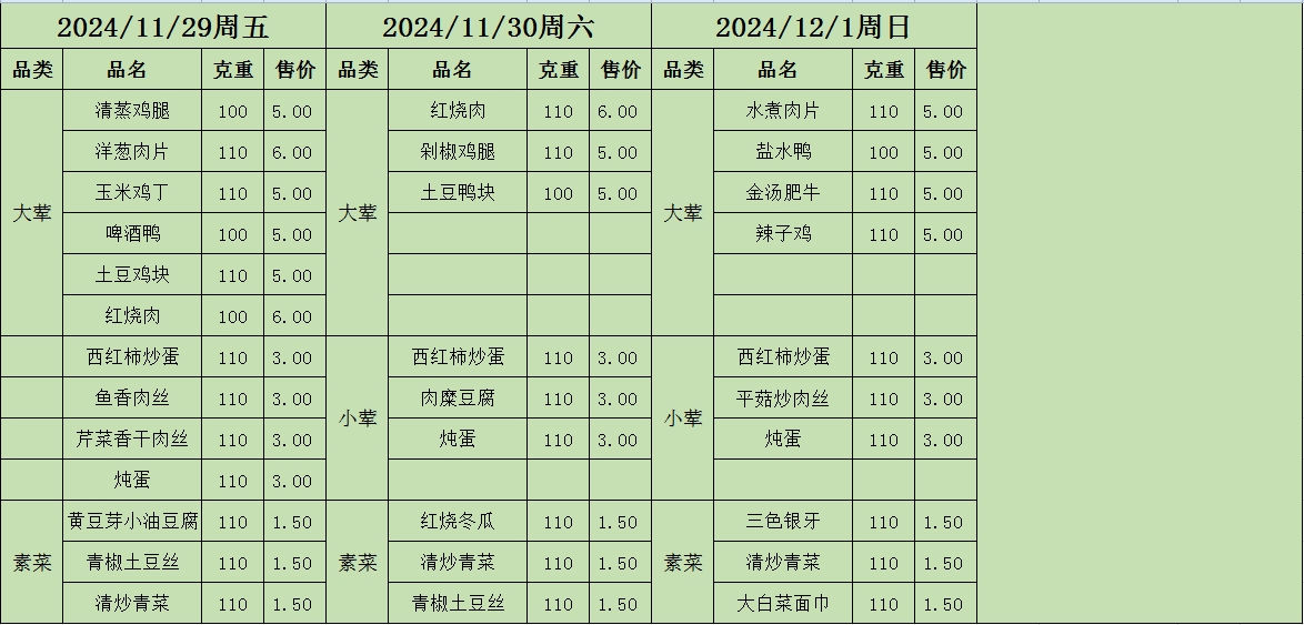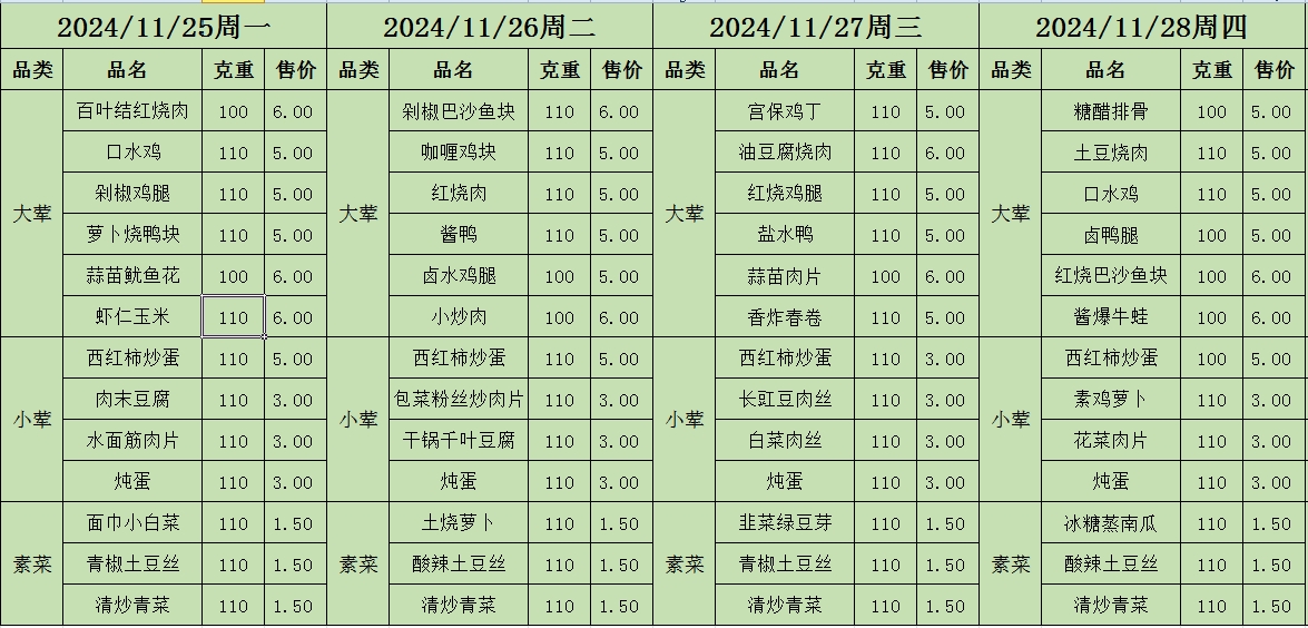 周菜单(2024年11月25日-12月01日--教育园校区食堂)