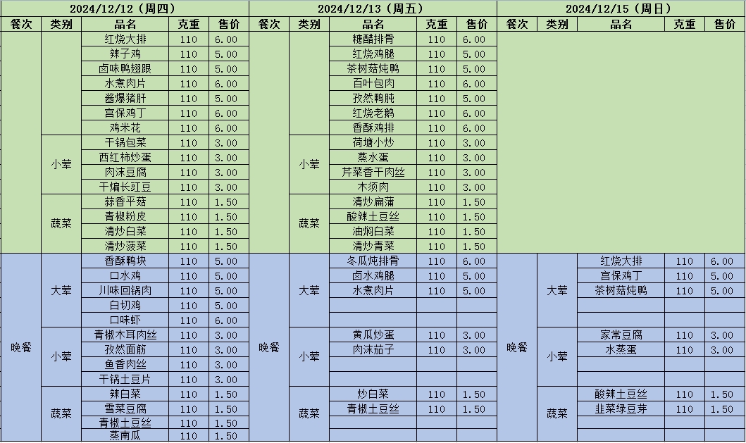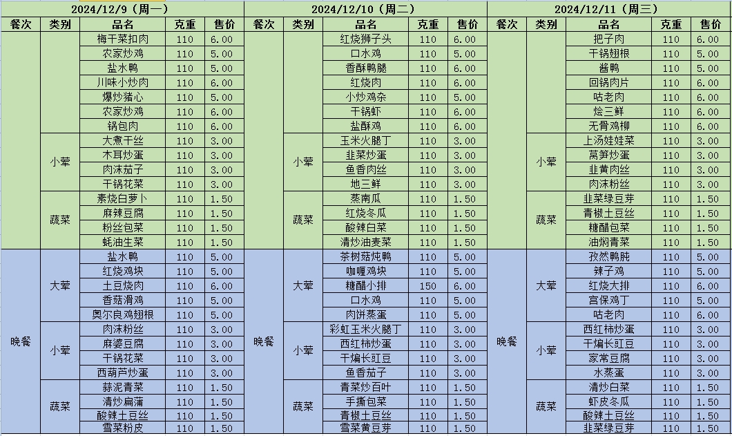 周菜单(2024年12月09日-12月15日--尹山湖校区食堂)
