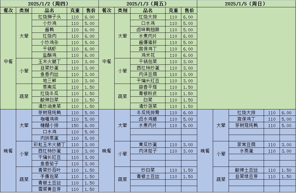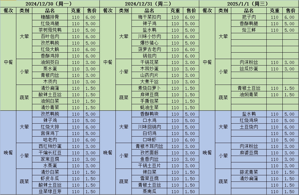 周菜单(2024年12月30日-2025年01月05日--尹山湖校区食堂)